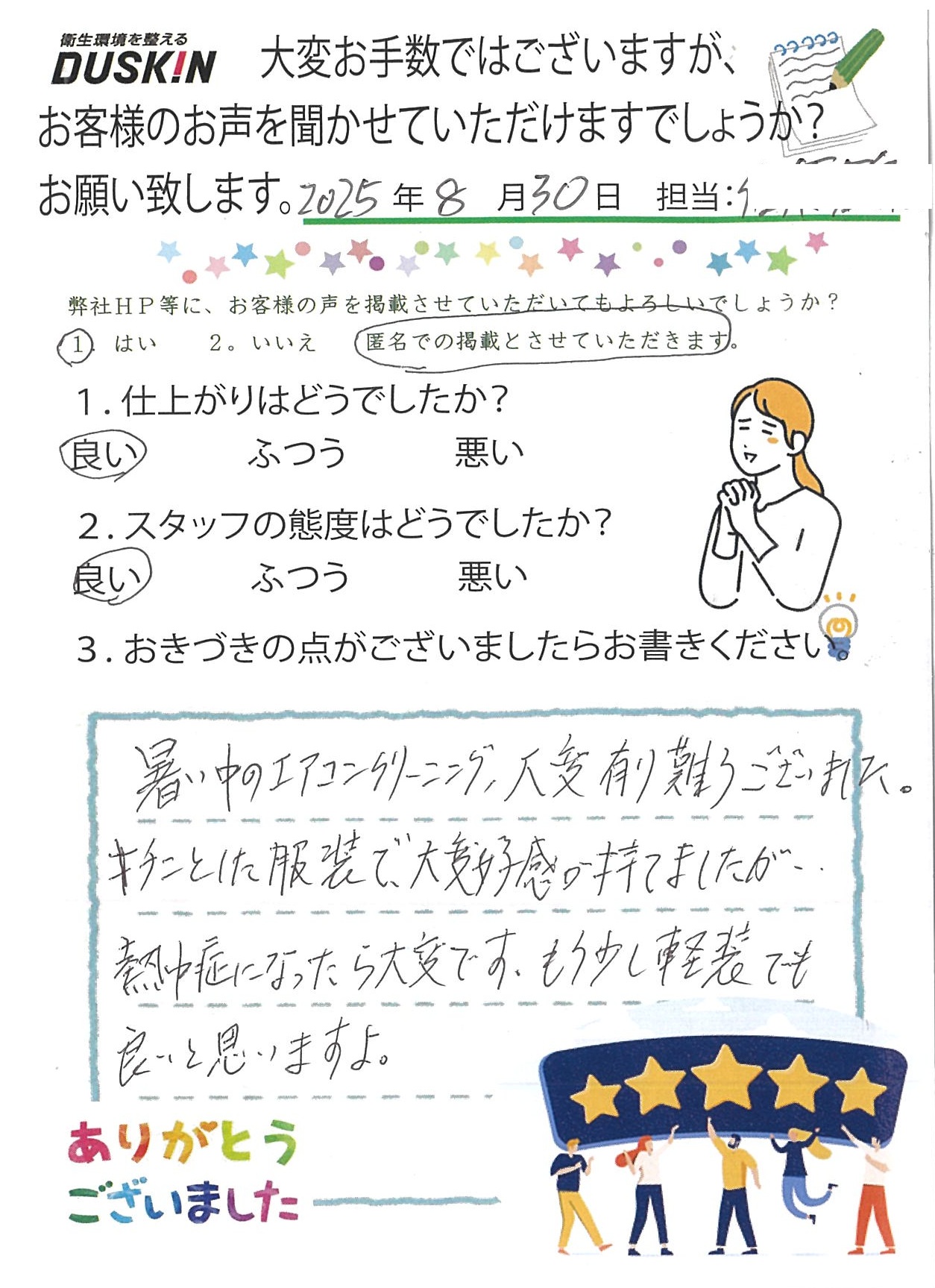 暑い中のエアコンクリーニング、大変有り難うございました。キチンとした服装で大変好感が持てましたが、熱中症になったら大変です。もう少し軽装でもよいと思いますよ。