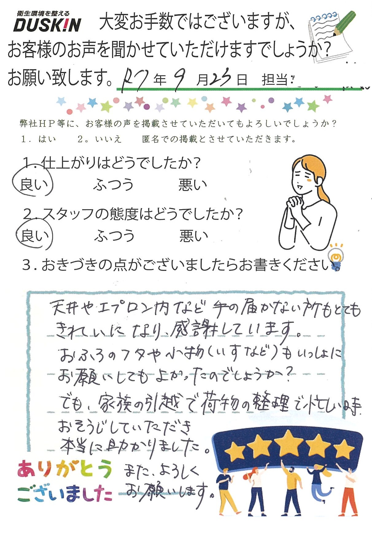 天井やエプロン内など手の届かない所もとてもきれいになり感謝しています。おふろのフタや小物(いすなど)もいっしょにお願いしてもよかったのでしょうか?でも、家族の引越で荷物の整理で忙しい時おそうじしていただき本当に助かりました。またよろしくお願いします。