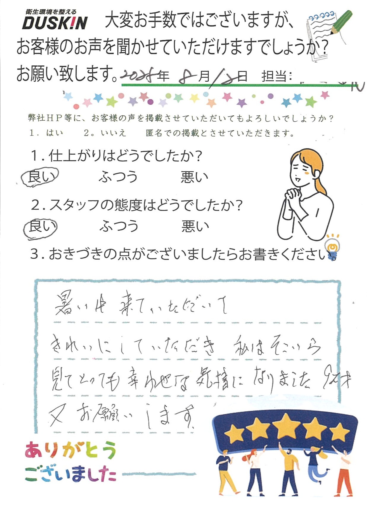 暑い中来ていただいて、きれいにしていただき、私はそこいら見てとって幸わせな気持になりました。又お願いします。