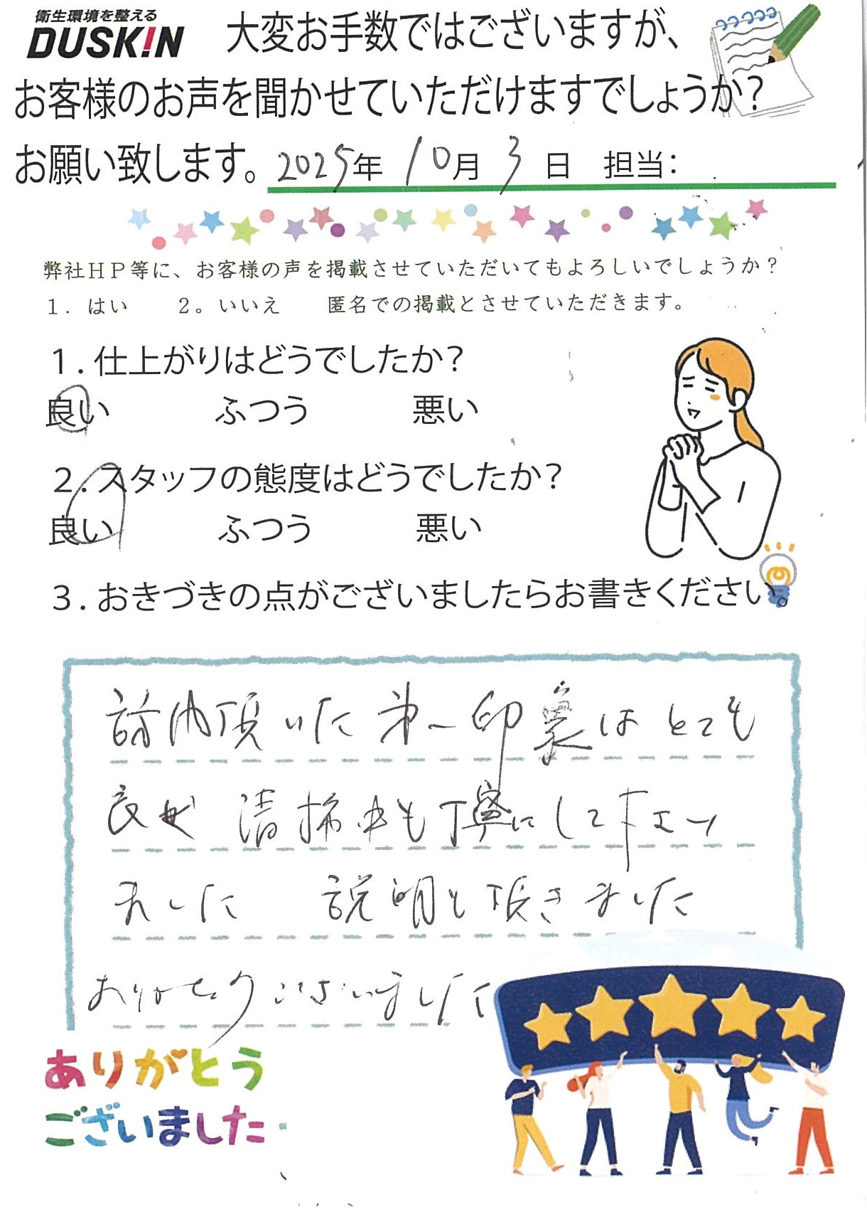 訪問頂いた第一印象はとても良く、清掃中も丁寧にして下さいました。説明も頂きました。ありがとうございました。