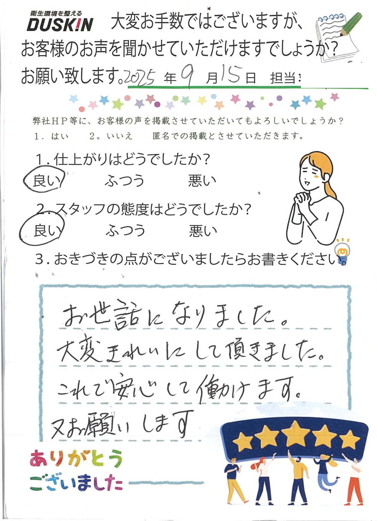 お世話になりました。大変きれいにして頂きました。これで安心して働けます。またお願いします。