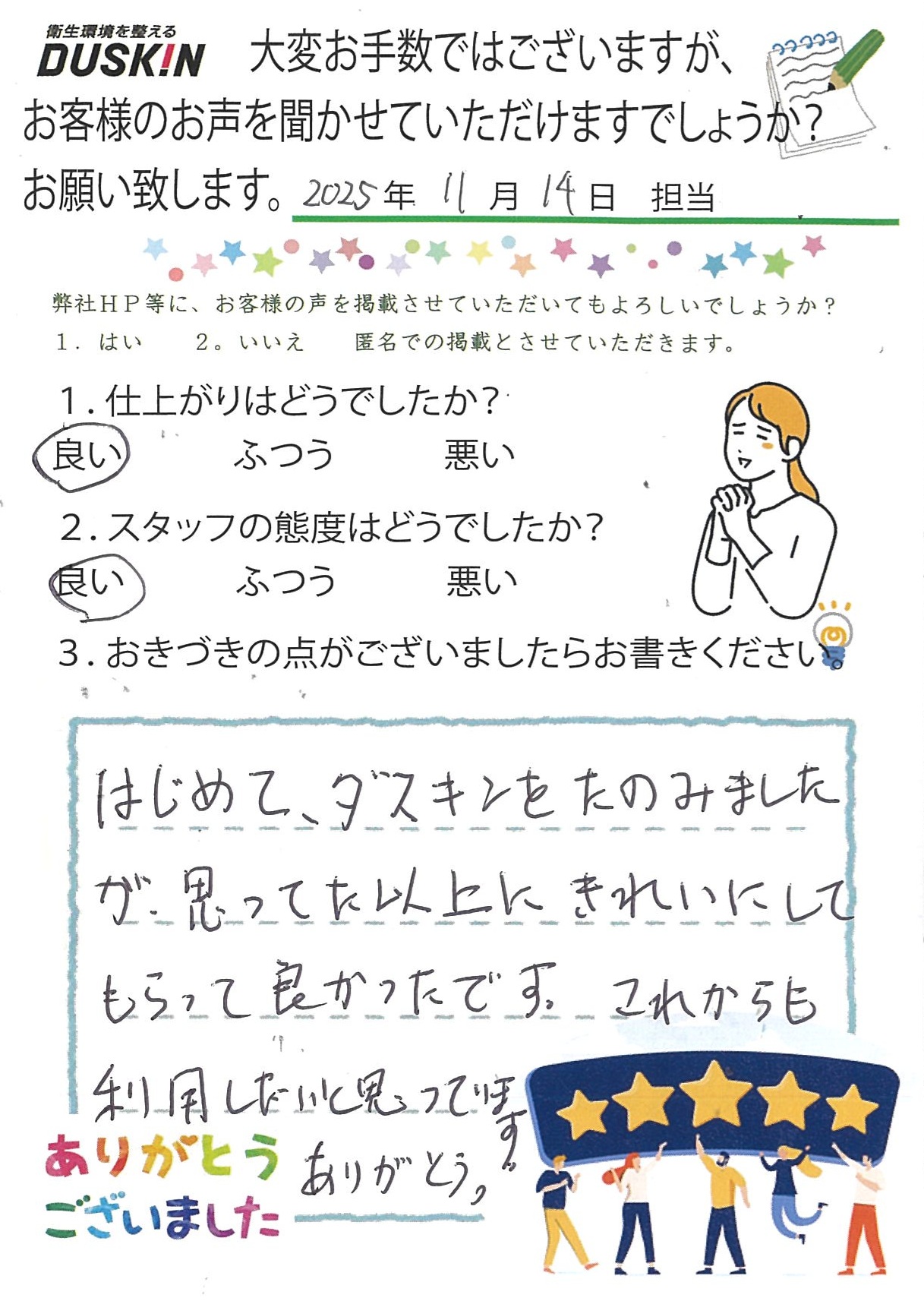 はじめてダスキンをたのみましたが、思っていた以上にきれいにしてもらって良かったです。これからも利用したいと思っています。ありがとう。
