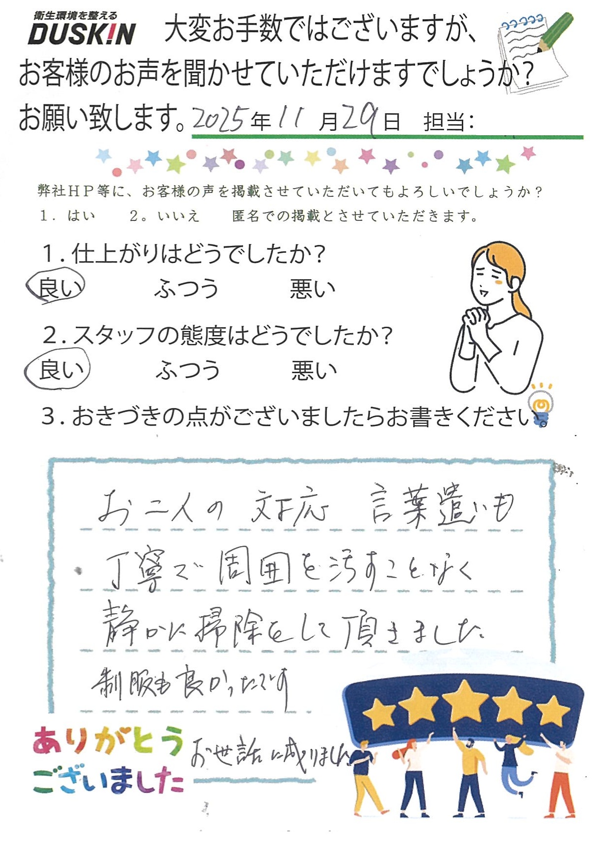 お二人の対応、言葉遣いも丁寧に周囲を汚すことなく静かに掃除をして頂きました。制服も良かったです。お世話に成りました。