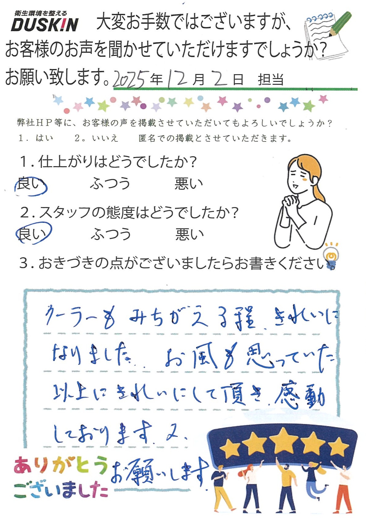 クーラーもみちがえる程きれいになりました。お風呂も思っていた以上にきれいにして頂き、感動しております。又、お願いします。