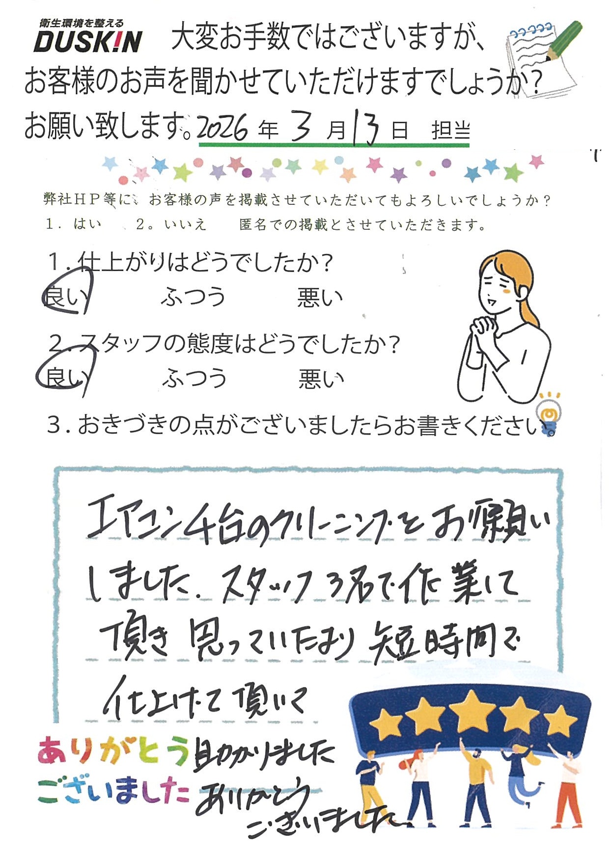 エアコン4台のクリーニングをお願いしました。スタッフ3名で作業して頂き、思っていたより短時間で仕上げて頂いて助かりました。ありがとうございました。